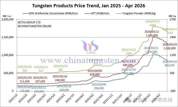Ammonium paratungstate (APT): RMB 1,340,000/ton, down 3.6% week-on-week, up 100.00% year-to-date
