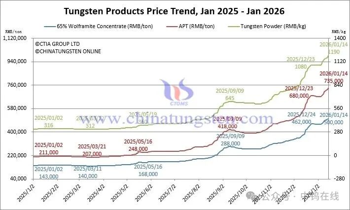 As of press time, tungsten concentrate prices have broken through RMB 500,000/ton, APT prices have surpassed RMB 730,000/ton, and tungsten powder prices are approaching RMB 1.2 million/ton!